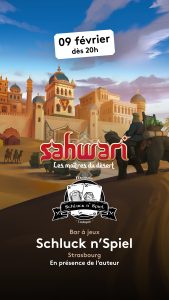 Le 9 février, vous pourrez découvrir ou redécouvrir le jeu SAHWARI en présence de son auteur Arnaud CHABLOZ , lors de la soirée jeux de société au bar à jeux Schluck n’Spiel à Strasbourg
